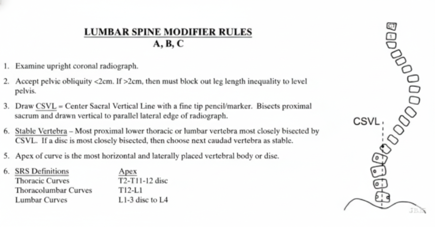 Assign Lumbar Modifier (A, B, C), Draw Central Sacral Vertical Line (CSVL)