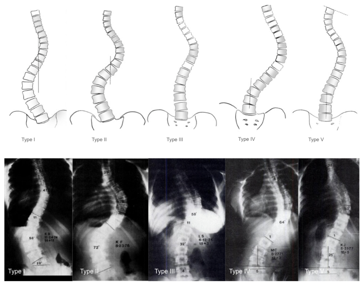 Figures adapted from: Lenke LG, Betz RR, Harms J, Bridwell KH, Clements DH, Lowe TG, Blanke K. Adolescent idiopathic scoliosis: a new classification to determine extent of spinal arthrodesis. J Bone Joint Surg Am. 2001 Aug;83(8):1169-81.