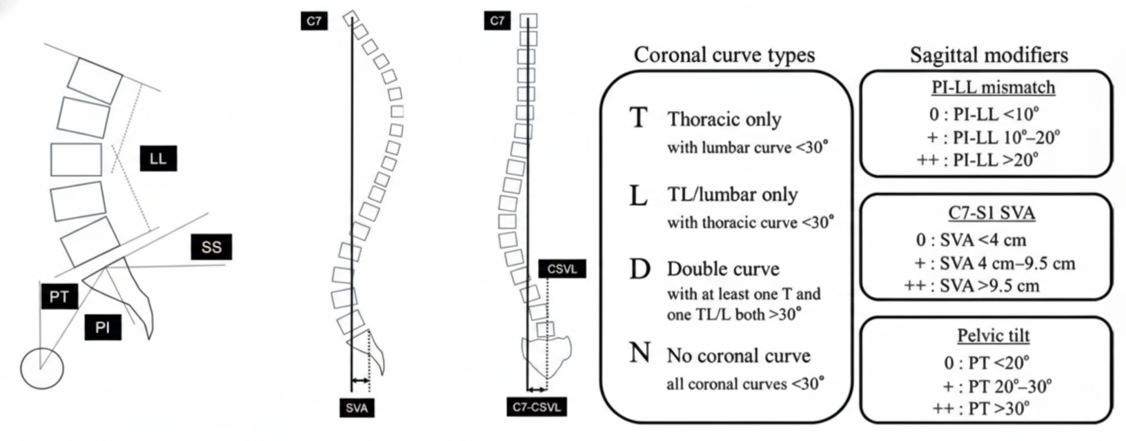 Sagittal modifiers quantify global balance and pelvic compensation using PI–LL mismatch, sagittal vertical axis (SVA), and pelvic tilt (PT). These modifiers capture both the severity of the deformity and the compensatory mechanisms patients use to remain upright.