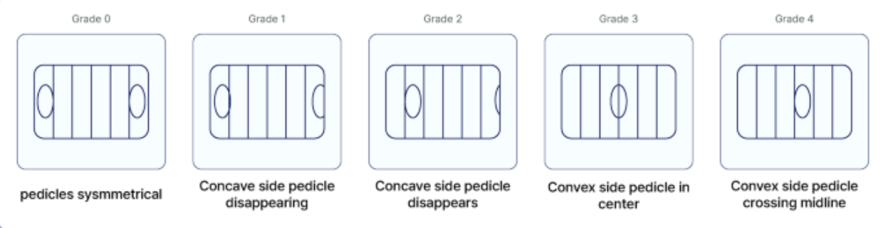 Grade 4: ~100° rotation; convex-side pedicle beyond midline; concave pedicle not visible